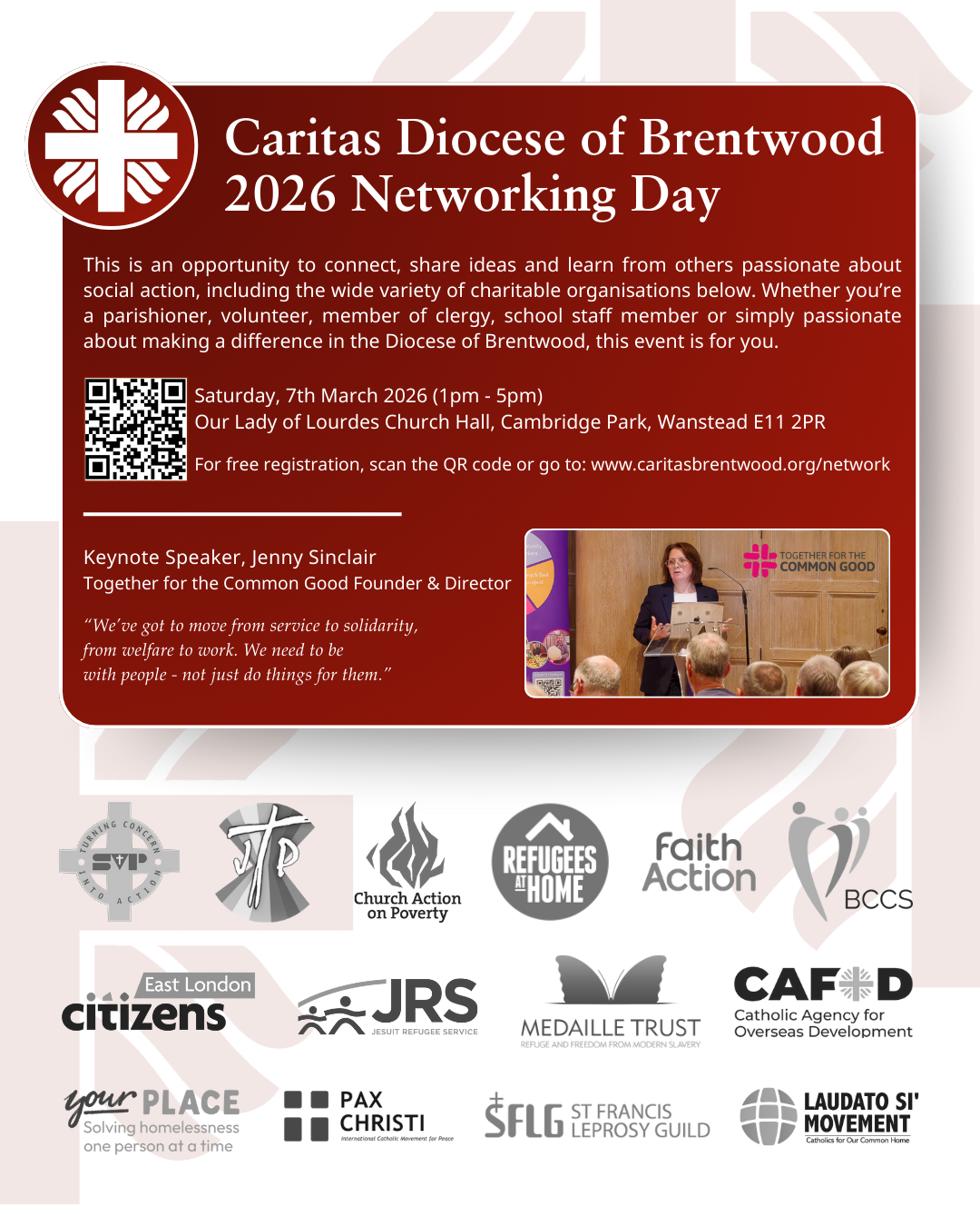 On 7 March at Our Lady of Lourdes Church Hall, Wanstead the 2026 Caritas Brentwood Networking Day will take place, and all parishes are encouraged to send representatives. This Networking Day is designed to bring together parishioners, clergy, school staff, catechists and those actively engaged in social justice, offering space to connect, share good practice and learn from one another across the Diocese.